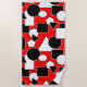 Cette serviette de plage a un design Bauhaus de triangles, cercles, rectangles et pentagons en noir et blanc sur un champ de rouge.