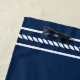 Serviette de plage avec ancre nautique blanche et texte personnalisable "bienvenue à bord" et votre nom de bateau. Design blanc sur arrière - plan bleu foncé.