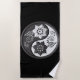 A yin yang symbol features intricate floral patterns on each side, one half in silver and the other in black. Delicate leaves and swirls add to the symmetrical elegance.