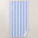 Serviette de plage classique avec rayures de cabane de couleur bleu clair (#B3CCF5) et blanc. Personnalisez-le maintenant avec un nom. Vous pouvez également ajouter un monogramme /logo etc. Conception par Alma Wad.