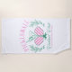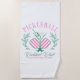 Cette serviette de plage de pickleball a une image d'art en ligne rose et verte de pédales de pickleball et un verre de martini entouré de branches de laurier avec l'expression "Pickleball Cocktail Club, Please Dink Responbly". Les couleurs utilisées sont le vert et le rose.