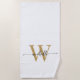 Serviette de plage personnalisée moderne et élégante avec monogramme initial en or et blanc, écriture personnalisée avec nom de famille ou prénom. Caractérisée par un prénom dans un joli style de lettrage manuscrit avec une typographie à queue en arabesque (ou calligraphie) avec monogramme initial en or et noir sur fond blanc. Cadeau féminin élégant pour pendre la crémaillère, également pour un anniversaire, un mariage, une fête des 16 ans, la fête des mères, un enterrement de vie de jeune fille, un EVJF, pour une fête de fin d'études et c'est pour la fille qui aime les choses élégantes et stylées.