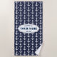 Serviette de plage personnalisée avec le motif nautique d'ancre. Copie de bleu marine et blanche élégante avec des lettres de citation, de nom ou de monogramme. Idée de cadeau mignon de vacances ou d'anniversaire pour lui. Copie d'ancre de bateau avec la couleur faite sur commande d'arrière - plan. De grande taille pour la plage ou la piscine. Créez les serviettes pour des amis, famille, marin, naviguant des enthousiastes, des enfants, le capitaine de bateau, le papa, la maman, le frère, l'oncle, la conception maritime d'icône de logo d'ancre de bateau du grand-papa etc. avec l'étiquette ovale. Ancre aweigh ! Propriété de modèle.