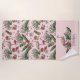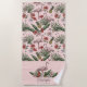 Cette plage de flamands roses tropicaux colorée ou serviette de piscine présente un motif floral de flamants roses dessinés à la main, de fleurs d'hibiscus et de jasmin, d'ananas, de feuilles de bananes et de boissons tropicales, le tout contre un élégant arrière - plan rose vif. Personnalisez avec le titre et le nom.