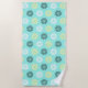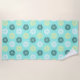 Serviette de plage avec un motif amusant d'inspiration océanique composé de petits hippocampes en aqua blanc, jaune et foncé sur un arrière - plan d'aqua clair.