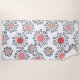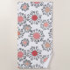 Cette serviette de plage au design moderne du milieu du siècle présente des fleurs en rond dans les tons rose, canneberge et beige et lignes noires.