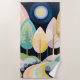 Un tableau éthérée et symbolique représentant une scène forestière stylisée et abstraite. De grands arbres en forme de larme aux branches épineuses dominent la partie supérieure de la toile, dont les toiles sont habillées de douces nuances de rose, de turquoise et d'or, dont certaines présentent des détails chatoyants sur les feuilles d'or. Un corps céleste, un grand orbe aux anneaux concentriques de bleu, de violet et de jaune, est suspendu dans le ciel bleu profond. Au premier plan, un paysage vallonné de collines arrondies dans différents pastels, traversé par un chemin sinueux aux couleurs arc-en-ciel. L'impression générale est celle d'un paysage onirique, mystique, rempli de couleurs vives et de formes géométriques.