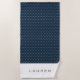 Obtenez votre serviette de plage personnalisée pour un look élégant avec motif chic preppy d'or et d'argent ancres sur arrière - plan bleu marine. Monogramme est sur une bordure blanche en fond en fonte sans serif or.