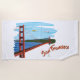 Une serviette pour n'importe qui qui aime San Francisco : caractéristiques de conception ce une illustration lunatique de golden gate bridge avec la Baie de San Franciso et la ville à l'arrière-plan. Un avion jaune vole au-dessus du pont remorquant une bannière avec le texte la "Californie" et une image de l'ours du drapeau d'état. Le texte "San Francisco" paraît dans en bas à droite dans une police espiègle et orange décrite dans le noir.