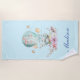 Une serviette de plage avec une charmante illustration d'un petit lapin qui longe une montgolfière ornée d'un joli ruban rose, agrémentée de fleurs et de papillons. Un arrière - plan bleu pastel lui donne une atmosphère de rêve vintage.