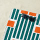 Cette serviette de plage au design moderne du milieu du siècle est composée de cinq lignes turquoises et de deux rectangles orange répétés à travers le design.