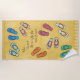 Des tongs de couleur vive sur un arrière - plan à motifs dorés. Dimensions: 70 po x 35 po. Matières: avant est un mélange de polyester, le dos est 100% coton. Lave-machine, sèche à lessive à basse température. Servez-vous de cette serviette pour votre prochaine journée de baignade, votre escapade sur la plage, votre pique-nique ou toute autre activité en plein air!