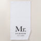 Cette serviette de plage élégante et minimaliste pour le mister dit "Mr" dans une police de luxe moderne et de haute couture en noir et blanc, et a également une place pour votre nom de famille et date mariage.