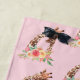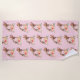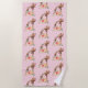 Une serviette de plage avec un joli dessin en aquarelles d'une maman et d'une petite girafe. La girafe mère se repose la tête au-dessus de la petite girafe, aimante et adorable. Joli bouquet de fleurs d'aquarelle rose, jaune, vert placé sous cette paire de chatons. Arrière - plan rose clair.