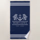 Lake house serviette de plage en bleu marine et blanc avec monogramme nautique avec ancre, verdure et corde. Ajoutez votre initiale et votre nom de famille et votre année d'établissement. Serviette de plage marine et blanche avec un monogramme d'ancre encadré de verdure, et votre nom de famille encadré par une corde.