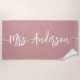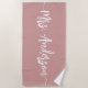 Célébrez votre nouveau statut de mariée avec cette serviette de plage personnalisée rose poudré rose blush avec votre nouveau nom de famille en lettrage script signature écrit à la main en blanc avec des fioritures au début et à la fin. Fait un excellent cadeau de mariage, de shower ou de lune de miel.