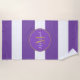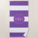 Profitez du soleil et détendez-vous avec élégance grâce à cette Serviette Monogram Beach Stripes violet moderne. Ce design moderne a de larges bandes horizontales violettes sur la bordure blanche arrière - plan et violet cercle au centre. Votre initiale est en faux or simple lettrage et personnalisée avec le nom de famille en blanc tendance écriture lettrée à la main. Cliquez sur l'option Personnaliser le modèle et suivez les invites.