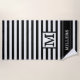 Serviette de plage rayée de cabane frappante avec motif rayé noir et blanc. Personnalisez avec votre monogramme et votre nom de famille.