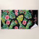 Une serviette de plage fleurie colorée prête pour une ambiance très tropicale avec des fleurs exotiques, des Hibiscus roses et des Feuilles de palmiers sur un arrière - plan noir. Pour égayer vos journées d'été où que vous alliez. Vous pouvez le rendre unique en ajoutant votre propre Monogramme et votre nom à partir du menu Personnaliser. Vous pouvez me contacter pour toute aide.
