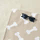 Cette serviette de plage a une forme d'os de chien beige au milieu avec une zone de texte personnalisable pour un nom. L'arrière - plan a un chien blanc os motif sur une couleur beige.