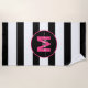 Élégant design moderne et moderne, noir et blanc, serti Monogram Beach Towel. Ajoutez une touche ludique et girly à votre expérience de la piscine ou de la navigation avec cette serviette monogrammée élégante. Avec des rayures noires et blanches épaisses, le design est centré avec un monogramme de script sophistiqué à l'intérieur d'un cercle. La bordure initiale et la bordure du cercle sont en rose vif magenta, ajoutant une touche ludique et féminine au design moderne. Toutes les couleurs peuvent être customisées selon votre style personnel ou correspondent à votre décor côtier, nautique ou préppant. Parfait pour se détendre au bord de la piscine, se détendre sur un bateau, profiter d'un week-end de bachelorette pour filles, ou comme un cadeau réfléchi pour les soeurs de la sororité, cette serviette allie fonctionnalité et style. C’est aussi idéal pour les anniversaires, les vacances ou toute occasion spéciale, ce qui en fait un must pour tous les amateurs d’accessoires chic et personnalisés !