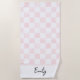 This beach towel has a pretty checkerboard print. With illustrations of painted pastel pink squares alternated with plain white squares. The lower edge of the towel is ready to be personalized with a name (or other custom text) in black script lettering.