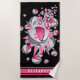 Cette amusante serviette de plage sur le thème du basket présente une "explosion" de balles de basket rose, gris et blanc de taille variée et des formes d'étoiles grises, roses et blanches sur un arrière - plan noir - un motif de pois blancs minuscules couvre l'étoile rose - customisez avec le monogramme de l'athlète sur le graphique des balles de football et nom sur des bandes de varsité rose orientées verticalement - par katz_d zynes