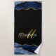 Une élégante serviette de plage de motif de parties scintillant en or bleu marine monogrammed avec nom et script initial.