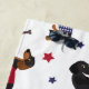 Dachshunds patriotiques habillés en rouge blanc et bleu avec étoiles, rayures et os de chien sur un arrière - plan blanc.