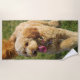 Cette mignonne serviette de plage photo de chien doré présente une adorable photo d'un chiot Golden Doodle. Ajoutez votre propre message personnalisé pour que ce design soit le vôtre ! Photographie créée par la photographe primée Maria Jeffs.