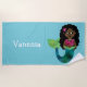 Serviette de plage personnalisée de filles de sirène d'aluminium de Faux d'Afro-américain. Petite sirène adorable avec la queue de vert d'aluminium de faux, le débardeur rose magenta et les étoiles de mer roses dans ses cheveux noirs foncés. Personnalisez avec le nom dans le blanc sur un joli arrière - plan de bleu d'océan. Customisez pour changer la couleur ou la police d'arrière - plan. www.SamAnnDesigns.com