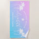 Le design personnalisé des serviettes de plage pour une escapade sur la plage de filles a un prénom personnalisé dans l'écriture de script moderne accentué d'une étoile de mer et encadré par des palmiers tropicaux. Personnalisez avec un nom et un texte personnalisé pour l'occasion spéciale. L'Arrière - plan est agrémenté d'un joli dégradé de coucher de soleil aux couleurs rose vif, violet et violet et bleu.