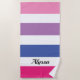 Cette serviette de plage design est décorée de rayures audacieuses de rose, violet, bleu et blanc avec typographie noire. Customisez-le en changeant le nom ou en le faisant un monogramme à la place.
