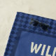 This beach towel is ready to be personalized with a name or other custom text. It features my hand drawn illustration of a werewolf skeleton riding a BMX bike. The comic book style graphic is in ivory, aqua blue and orange and set against a darker blue background. The edges of the towel have a blue on blue checkerboard pattern.