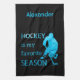 Turquoise Blue patin à glace personnalisée "saison préférée" - un cadeau pour les joueurs de hockey qui est utile car il est essentiel de sécher les pales après l'entraînement.Couleur: Glace bleu turquoise sur arrière - plan noir.Design: "Le hockey est ma saison préférée" + silhouette du joueur de hockey + personnalisation avec le nom de l'amoureux du hockey.