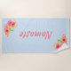 Jolie serviette de plage au thème du yoga faite en bleu clair, avec des graphiques de fleurs tropicales colorées.Texte couleur corail lit Namaste et peut être personnalisé pour lire ce que vous voulez.