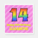Cette serviette en papier joyeuse et joyeuse sur le thème du 14e anniversaire présente un grand nombre de "14" ayant un motif coloré inspiré par l'aspect d'un arc-en-ciel spectre. Il comporte également le message "Joyeux 14e anniversaire", suivi d'un nom personnalisé. L'arrière - plan est décoré d'un joyeux motif aux rayures rose clair et rose foncé, aux coeurs roses aimés. Des serviettes en papier sur le thème de l'anniversaire comme celle-ci pourraient être amusantes à utiliser lors d'une célébration organisée pour honorer quelqu'un qui célèbre son quatorzième anniversaire. [~Z0000417]