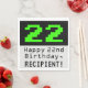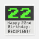 Ce design de serviette en papier à thème d'anniversaire amusant et nerdy comprend un grand jeu vidéo vintage vert numéro "22" sur un arrière - plan de couleur noire. Il comporte également le message de voeux d'anniversaire "Joyeux 22e anniversaire", et un nom personnalisé. Des serviettes en papier amusantes comme celle-ci pourraient être utilisées lors d'une fête organisée pour célébrer le 22e anniversaire d'un historien de l'informatique, d'un ingénieur ou d'une personne qui apprécie les jeux vidéo. [~Z0000404]