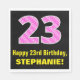 Cette conception de serviettes en papier sur le thème d'un anniversaire joyeux et amusant comporte un grand nombre "23" ayant un motif rayé contenant des formes de cœur de couleur rose clair et rose foncé. Il comporte également le message de vœux d'anniversaire "Joyeux 23e anniversaire" et un nom personnalisé. Des serviettes en papier comme celle-ci pourraient être agréables à avoir lors d'une fête organisée en l'honneur du vingt-troisième anniversaire de quelqu'un. Cela pourrait également être un choix amusant pour quelqu'un dont l'anniversaire tombe le 14 février (la Saint-Valentin), en raison de ses symboles et couleurs de cœur aimants.
