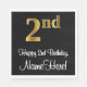 Cette conception sophistiquée, élégante et luxueuse de serviette en papier à thème d'anniversaire comporte un grand numéro ordinal "2nd" ayant un look faux/imitation or, plus le message de voeux d'anniversaire "Happy 2nd Birthday," et un nom modifiable dans une police de style script. L'arrière - plan est noir de couleur. Des serviettes en papier sur le thème de l’anniversaire comme celle-ci pourraient être une façon amusante de célébrer le 2e anniversaire de quelqu’un. [~Z0000516]