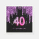 Une serviette en papier tendance et glamour pour 50ème anniversaire. Un arrière - plan noir classique décoré avec des gouttes de parties scintillant couleur violet foncé, la peinture goutte à goutte. Avec le texte : 40 et fabuleux. Personnalisez et ajoutez un nom. Texte de couleur violet et rose-chaud. Le mot Fabulous est écrit avec un script de style moderne écrit à la main. Age 40 est écrit avec un script de style ballon.