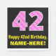 Ce design joyeux et amusant de serviette en papier à thème d'anniversaire comporte un grand numéro "42" avec un motif rose foncé et rose clair à rayures contenant des formes cardiaques. Il comporte également le message de voeux d'anniversaire "Joyeux 42e anniversaire", et un nom personnalisable. Des serviettes en papier comme celle-ci peuvent être amusantes à utiliser à la fête du 42e anniversaire de quelqu’un ou à la célébration. Ce pourrait aussi être un choix amusant pour quelqu'un qui a un anniversaire qui tombe le 14 février (Saint-Valentin), en raison de ses symboles et couleurs de coeur aimés. [~Z0000436]
