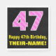 Cette conception amusante et joyeuse de serviette en papier sur le thème de l'anniversaire dispose d'un grand numéro "47" avec un motif à rayures rose clair et rose foncé contenant des formes cardiaques. Il comporte également le message de voeux d'anniversaire "Joyeux 47e anniversaire", et un nom personnalisé. Des serviettes en papier comme celle-ci peuvent être amusantes à utiliser à l’occasion de la fête de quarante-septième anniversaire de quelqu’un. Cela pourrait aussi être un choix amusant pour quelqu'un qui a un anniversaire qui tombe le 14 février (Saint-Valentin), en raison de ses symboles et couleurs de coeur aimés. [~Z0000436]