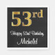 Ce design élégant, sophistiqué et luxueux de serviette en papier à thème d'anniversaire comporte un grand numéro ordinal "53ème" ayant une apparence imitation/faux or, ainsi que le message de voeux d'anniversaire "Happy 53ème anniversaire", et un nom personnalisé dans une police de style script. L'arrière - plan est noir de couleur. Des serviettes en papier comme celle-ci peuvent être utilisées pour célébrer le cinquante-troisième anniversaire de quelqu’un. [~Z0000516]