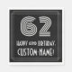 Cette serviette en papier inspirée du style des années 1920/1930 est décorée d'un grand modèle Art déco inspiré du numéro "62", du message "HAPPY 62nd BIRTHDAY", d'un nom personnalisable et d'un motif de frontière composé de lignes. Des serviettes en papier sur le thème de l’anniversaire comme celle-ci peuvent être amusantes à utiliser lors d’une fête organisée pour célébrer le soixante-deuxième anniversaire de quelqu’un. [~Z0000395]
