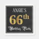 This fancy and ornate birthday paper napkin design features an editable name and the message "66th Birthday Party". Le grand nombre "66th" has a faux/imitation gold-inspired coloring pattern, and the words "Birthday Party" are in script-style text. The background is colored black by default (although it can be customized). Opulent, luxueux paper napkins like this might be useful to have at a birthday celebration being herst to celebrate somebody’s 66th birthday. [~Z0000565]