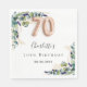 Pour une soirée élégante de 70ème anniversaire. Un arrière - plan blanc. Décoré avec des feuilles d'eucalyptus couleur verte, sprigs, verdure, feuilles dorés. Personnalisez et ajoutez un nom et une date. Le numéro 70 est écrit avec une police de style ballon.