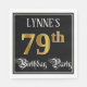 This ornate and fancy birthday themed paper napkin design a personalized name and the message "79th Birthday Party". The large number "79th" has a faux/imitation gold-inspecred coloring pattern, and the words Birthday Party are in luxurious script style. The background is colored black by default (although it can be customized). Luxurieux, elegant paper napkins like this might be useful at a birthday celebration/party ge held to celebrate somebody's seventy ninth birthday. 2