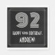 Ce design de serviette en papier à thème d'anniversaire d'apparence vintage comprend un grand style Art déco inspiré du numéro "92", le message "HAPPY 92nd BIRTHDAY", un nom personnalisé, et un motif frontalier composé de lignes. Des serviettes en papier sur le thème de l’anniversaire, amusantes et customisées, comme celle-ci, pourraient être utilisées lors de la célébration du quatre-vingt-dix-deuxième anniversaire de quelqu’un. [~Z0000395]