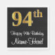 Ce design luxueux, sophistiqué et élégant de serviette d'anniversaire comporte un grand numéro ordinal "94th" avec un motif dégradé imitation/faux d'inspiration or, ainsi que le message de voeux d'anniversaire "Happy 94th Birthday," et un nom personnalisé dans une police de style script. L'arrière - plan est noir de couleur. Des serviettes élégantes en papier à thème d’anniversaire comme celle-ci pourraient être utilisées lors d’une fête d’anniversaire célébrant le 94e anniversaire de quelqu’un. [~Z0000516]